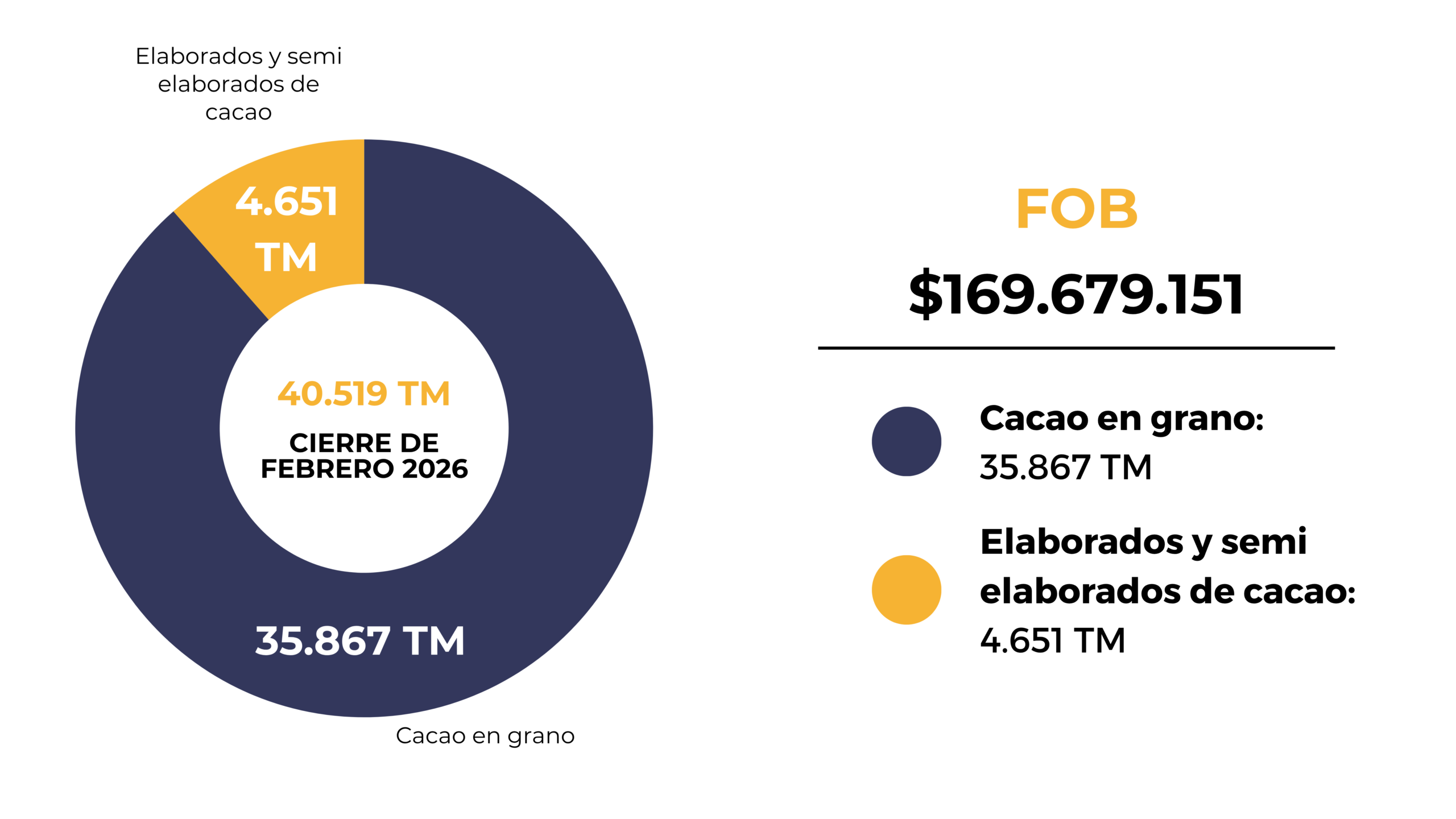 Cierre de exportaciones sector cacaotero – Febrero 2026 RESULTADOS DE EXPORTACIONES SECTOR CACAOTERO CIERRE DE FEBRERO 2026 PRINCIPALES DESTINOS DE EXPORTACIONES: Accede a todas las cifras y precios actualizados del cacao en INFOCACAO. Correo: comex@anecacao.comTeléfono: 099 357 9939 Calendario eventos Anecacao 2026 Claves para comercializar cacao en el mercado europeo bajo estándares de sostenibilidad y trazabilidad Related Posts Claves para comercializar cacao en el mercado europeo bajo estándares de sostenibilidad y trazabilidad April 2, 2026 Calendario eventos Anecacao 2026 March 12, 2026 Calendario eventos Anecacao 2025 January 13, 2025 Por qué subieron los precios del cacao y qué significa para los amantes del chocolate April 5, 2024 “Los precios del cacao y el chocolate se disparan por la propagación de enfermedades en los cultivos” – Euronews March 6, 2024 Leave your thought here Cancel replyYour email address will not be published. Required fields are marked * Save my name, email, and website in this browser for the next time I comment.